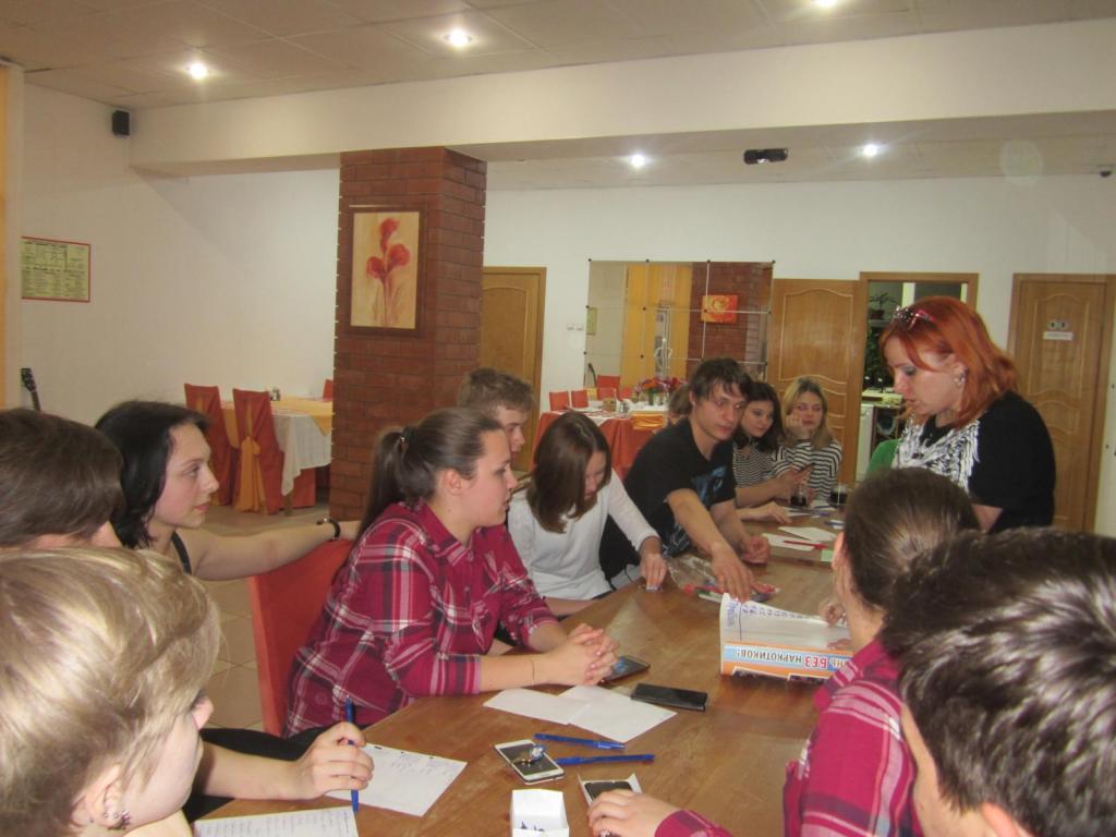 Вечером в гостинице для студентов был проведен тренинг, во время которого они тренировались выступать на сцене, работать в команде и писать сценарии мероприятий.