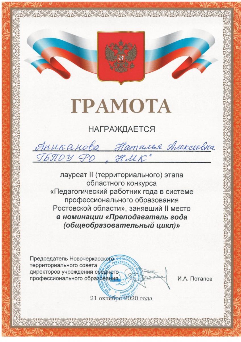 Успешно выступила на конкурсе представитель Новочеркасского машиностроительного колледжа Наталья Алексеевна Аниканова. Она стала лауреатом 2 степени в номинации "Преподаватель года (общеобразовательный цикл").
