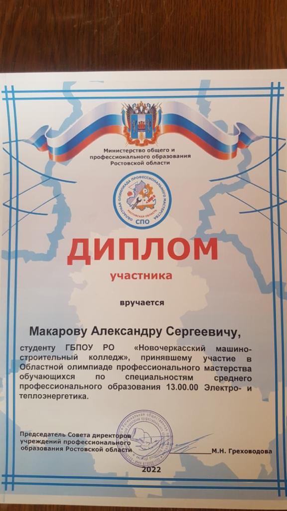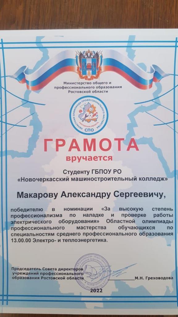 По итогам олимпиады Александр Макаров получил грамоту победителя в номинации «За высокую степень профессионализма по наладке и проверке работы электрического оборудования»
